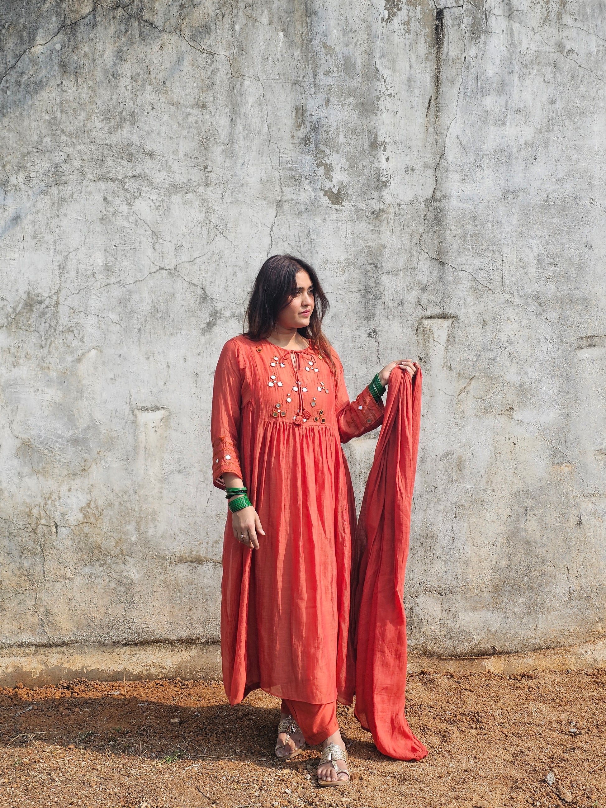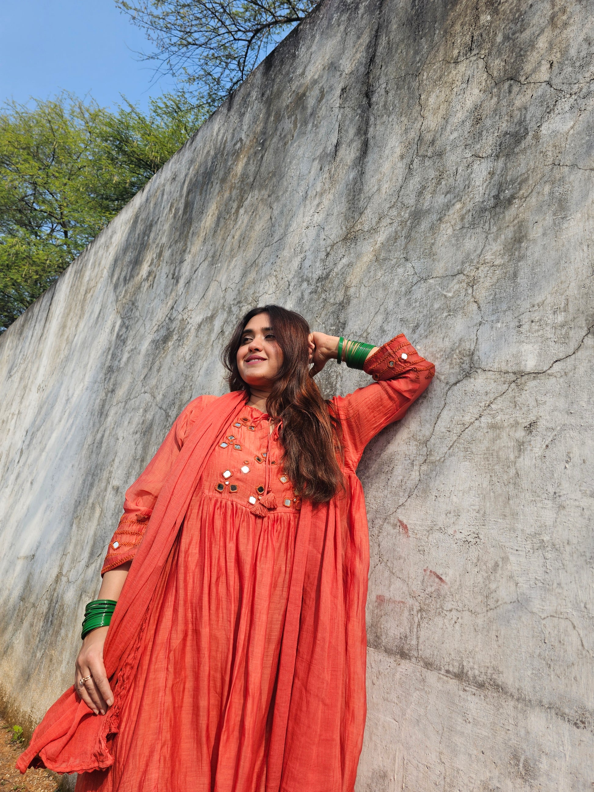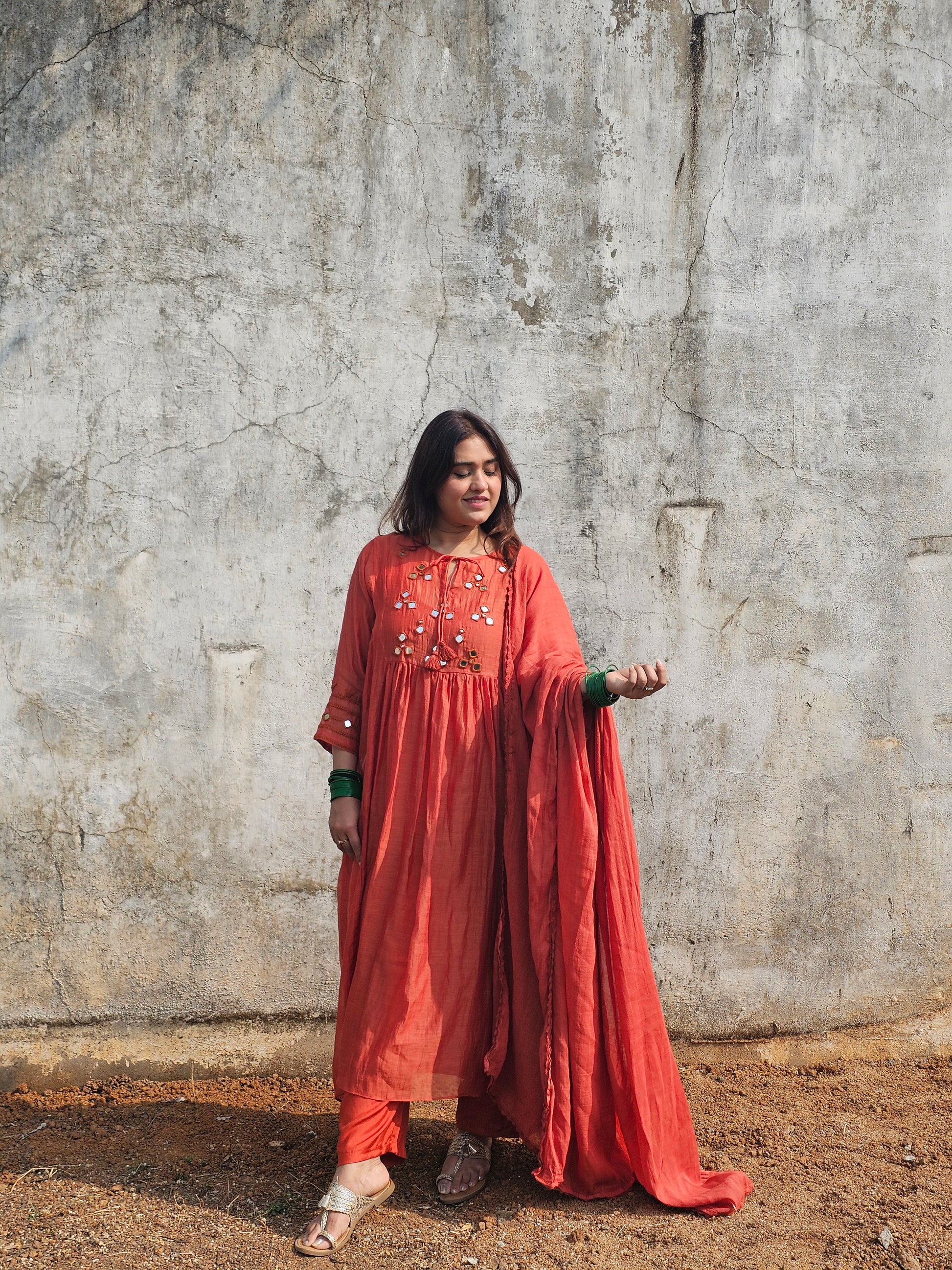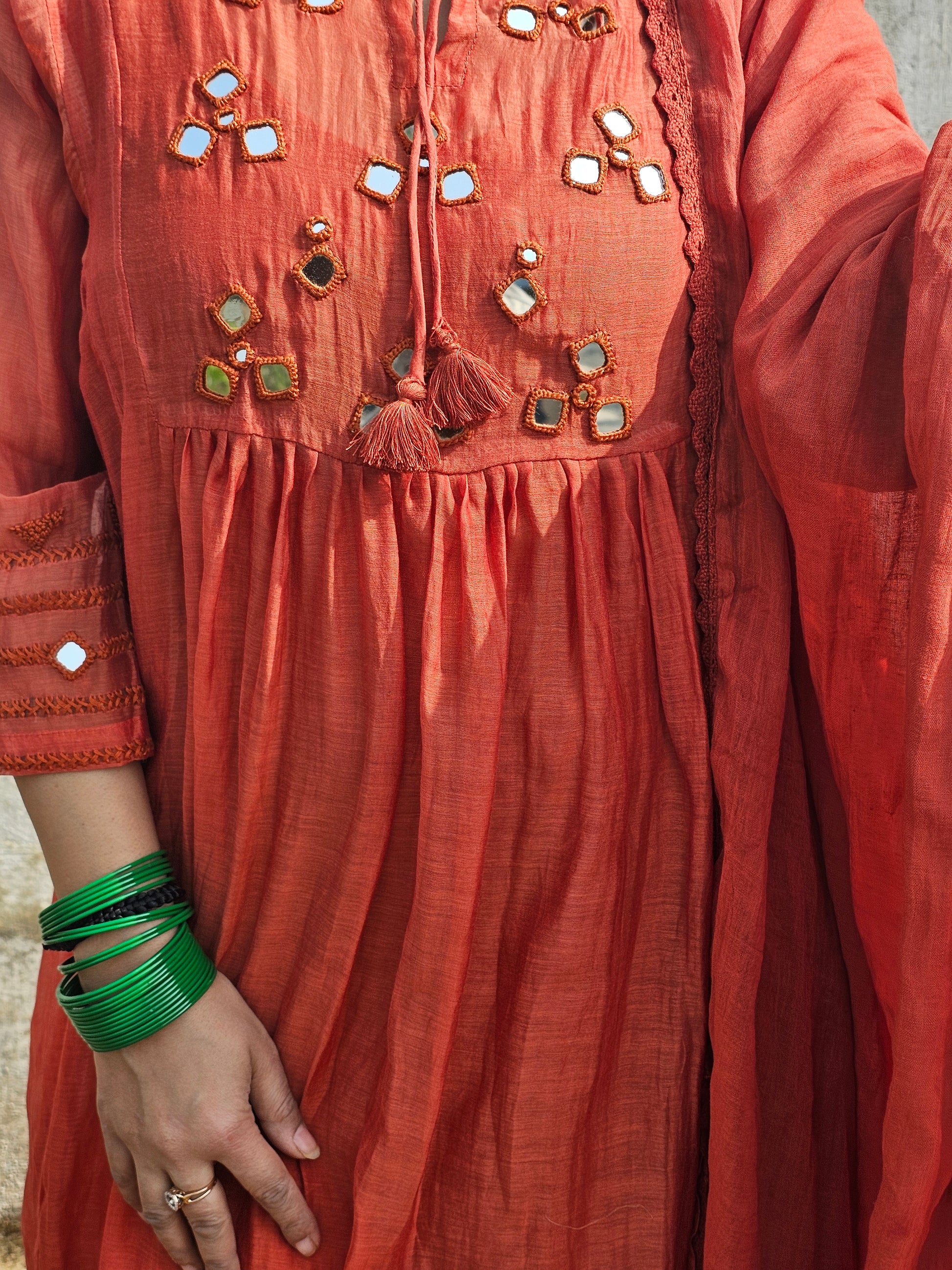 Pure mul chanderi suit in beautiful rust with original mirror work in super premium quality