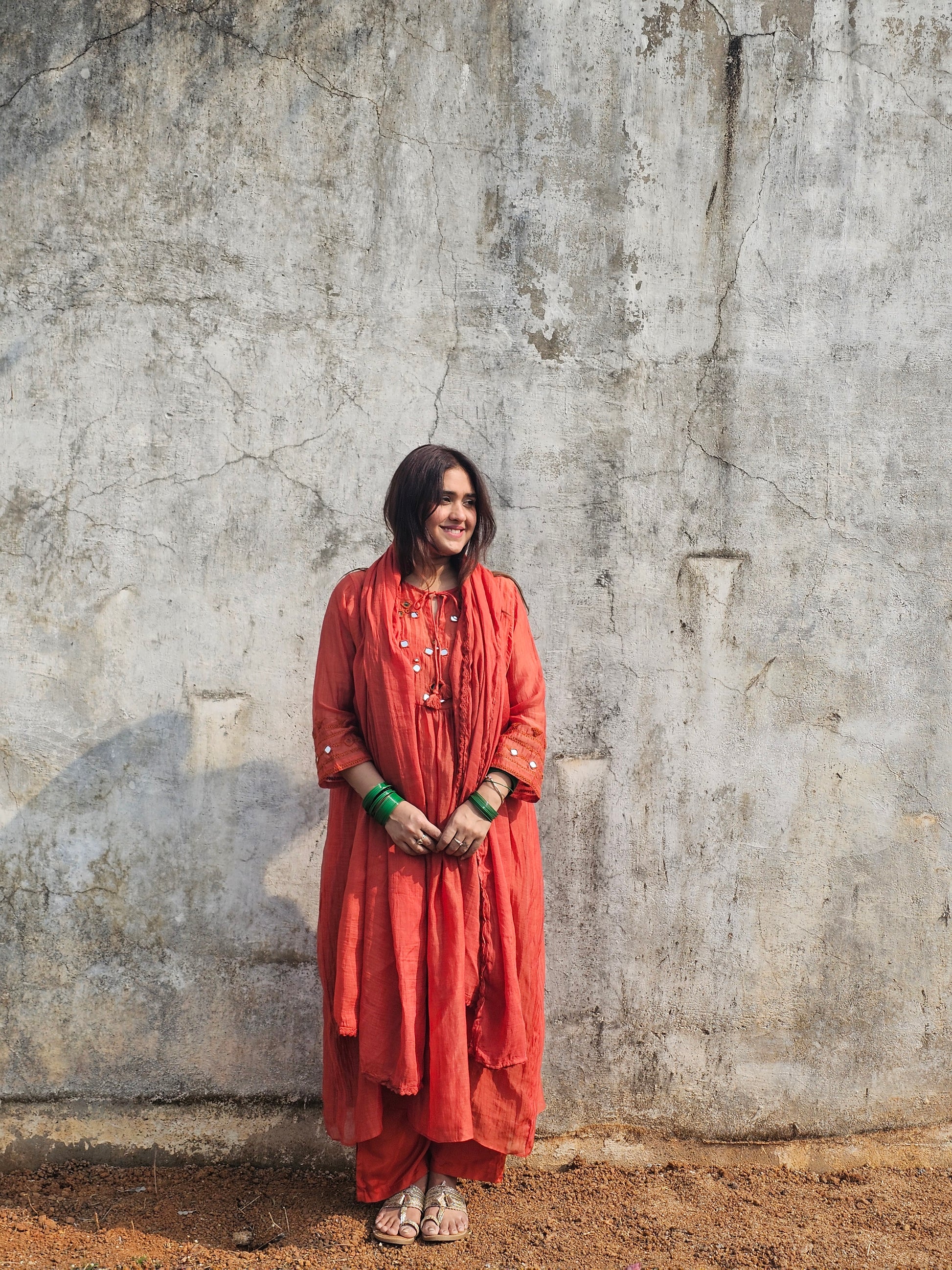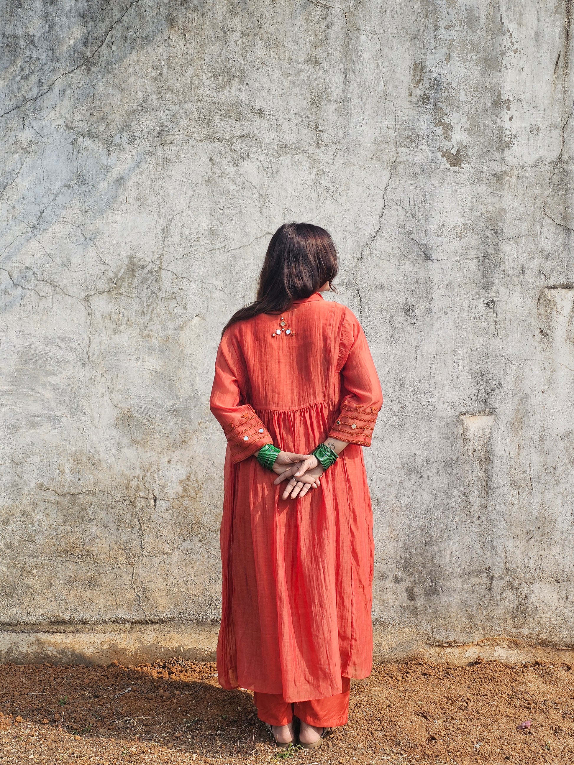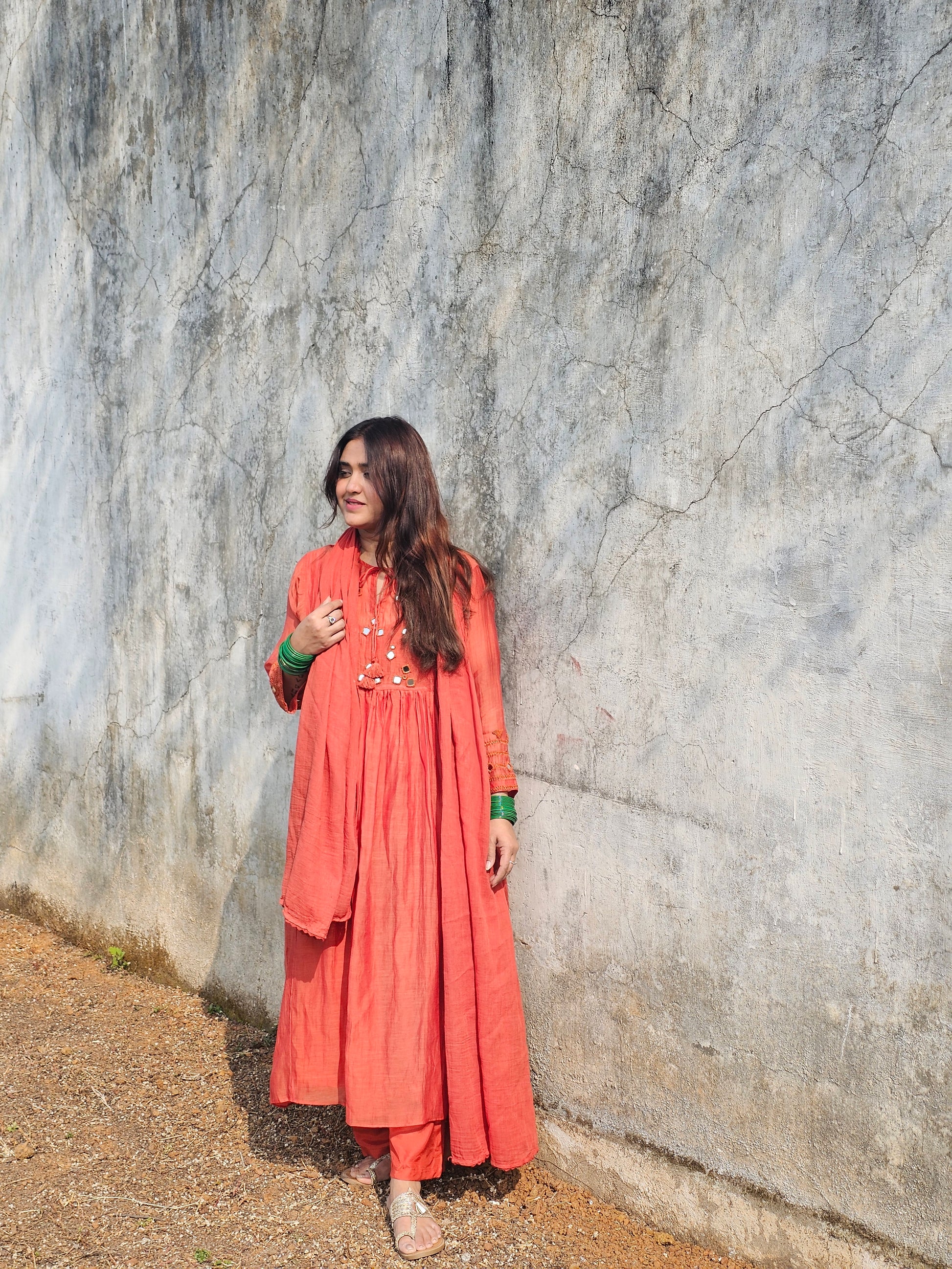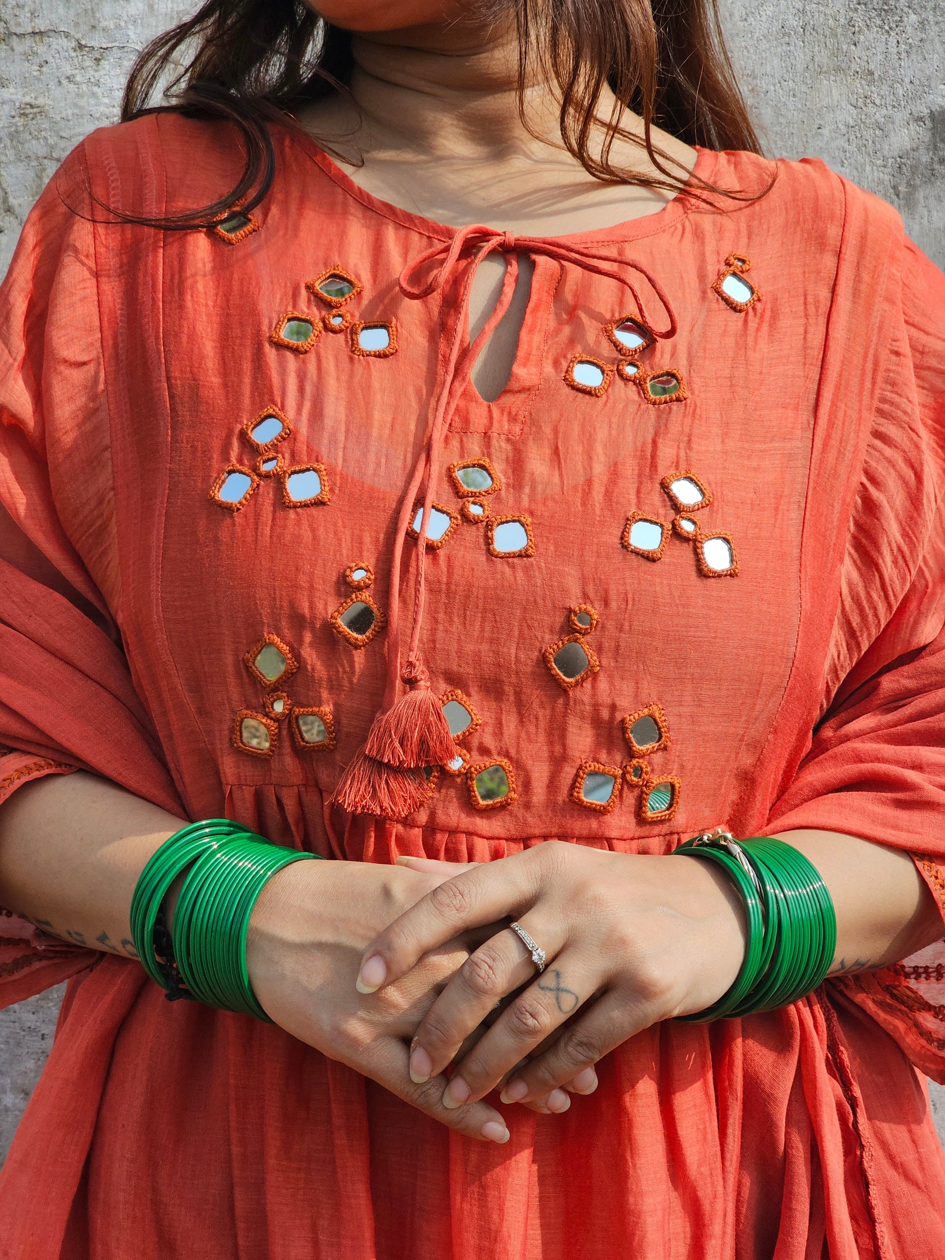 Pure mul chanderi suit in beautiful rust with original mirror work in super premium quality