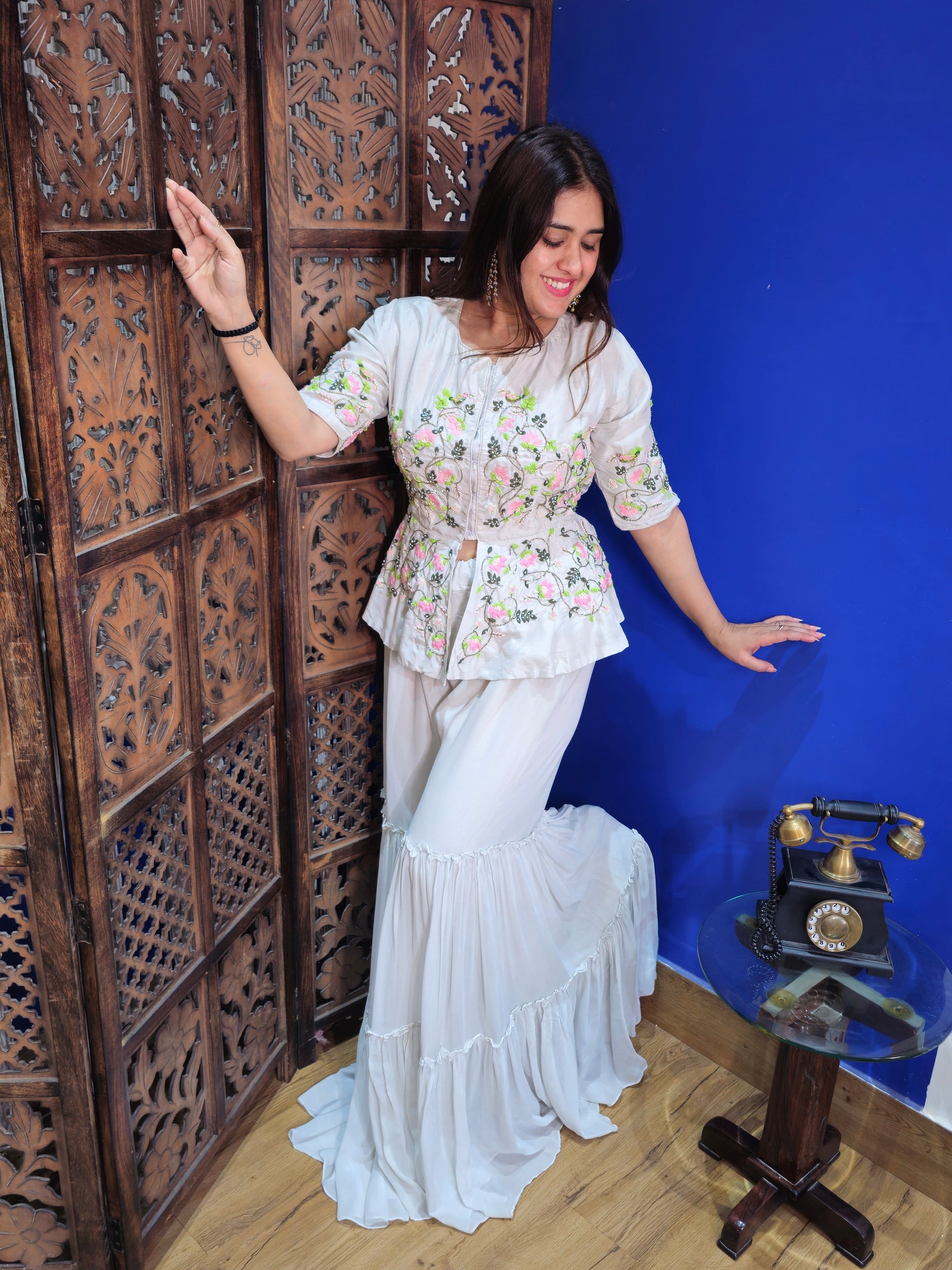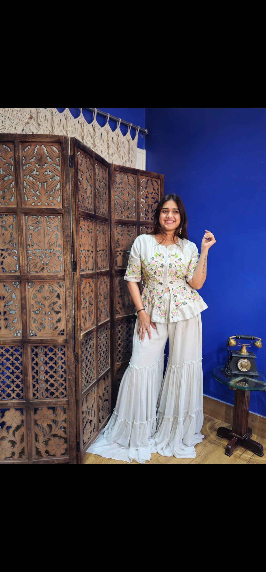 Product Description: A stylish pure georgette divider set featuring a flowy silhouette and modern ethnic look. Perfect for festive occasions and elegant everyday wear.