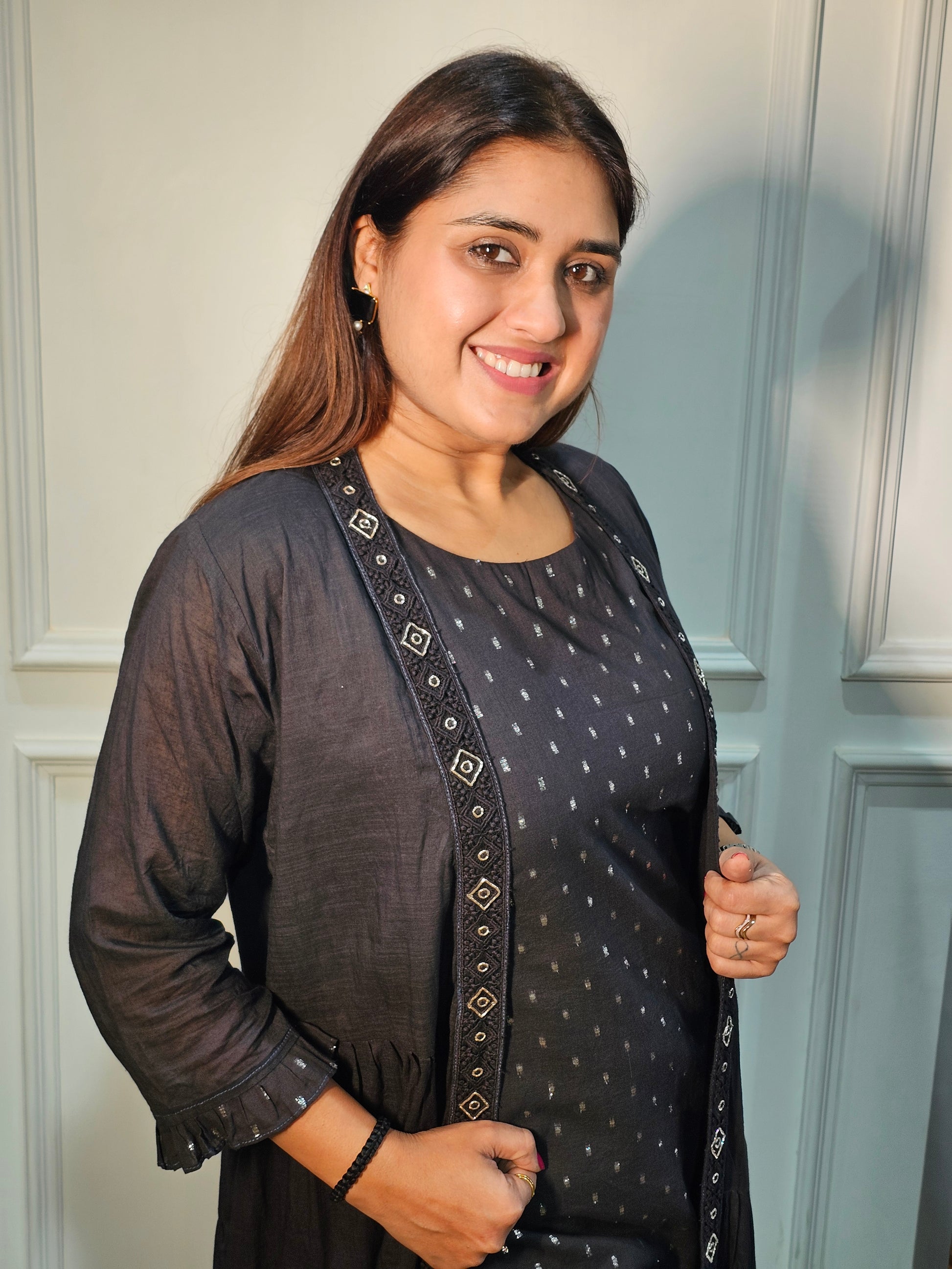 Product Description: A beautifully designed Indo-Western 3-piece set crafted in pure cotton for a soft, breathable, and elegant look. Perfect for festive, casual, and modern ethnic styling.