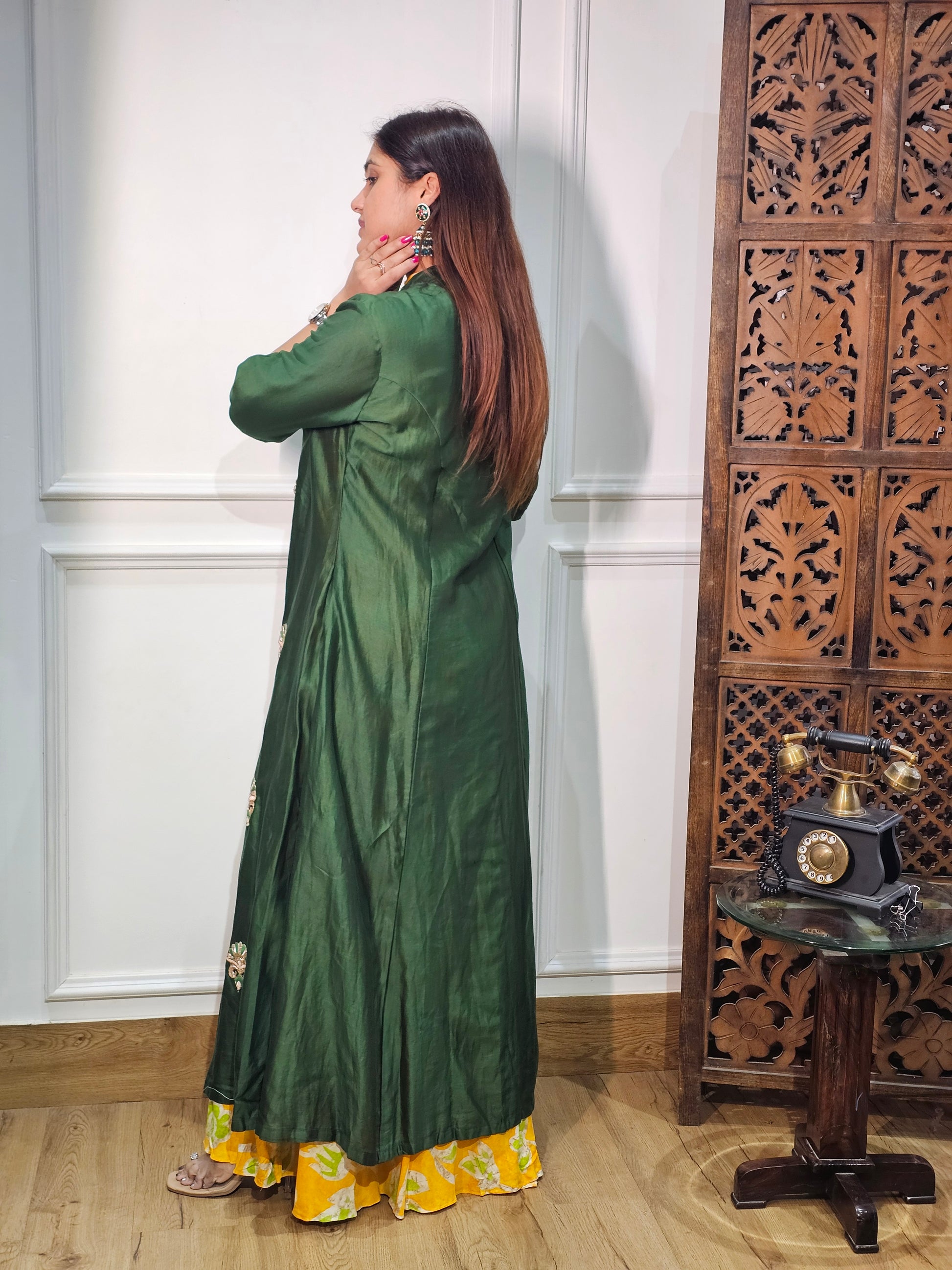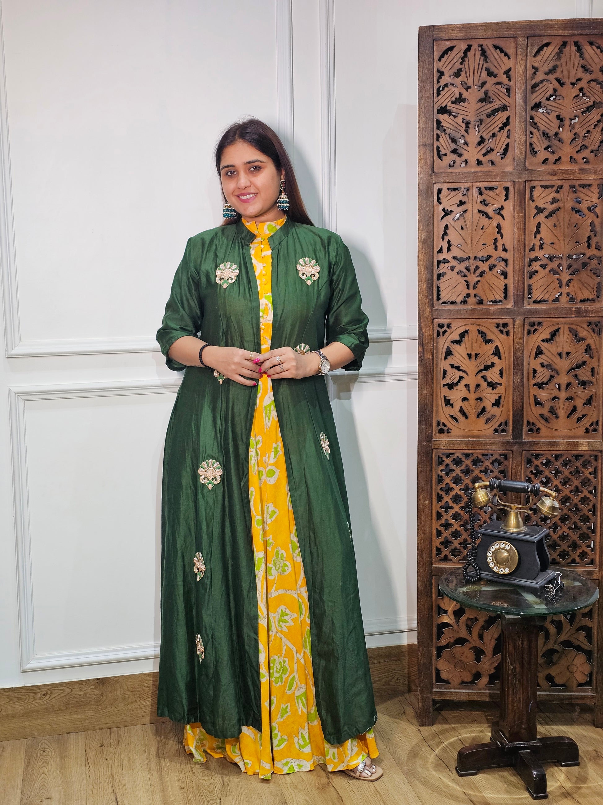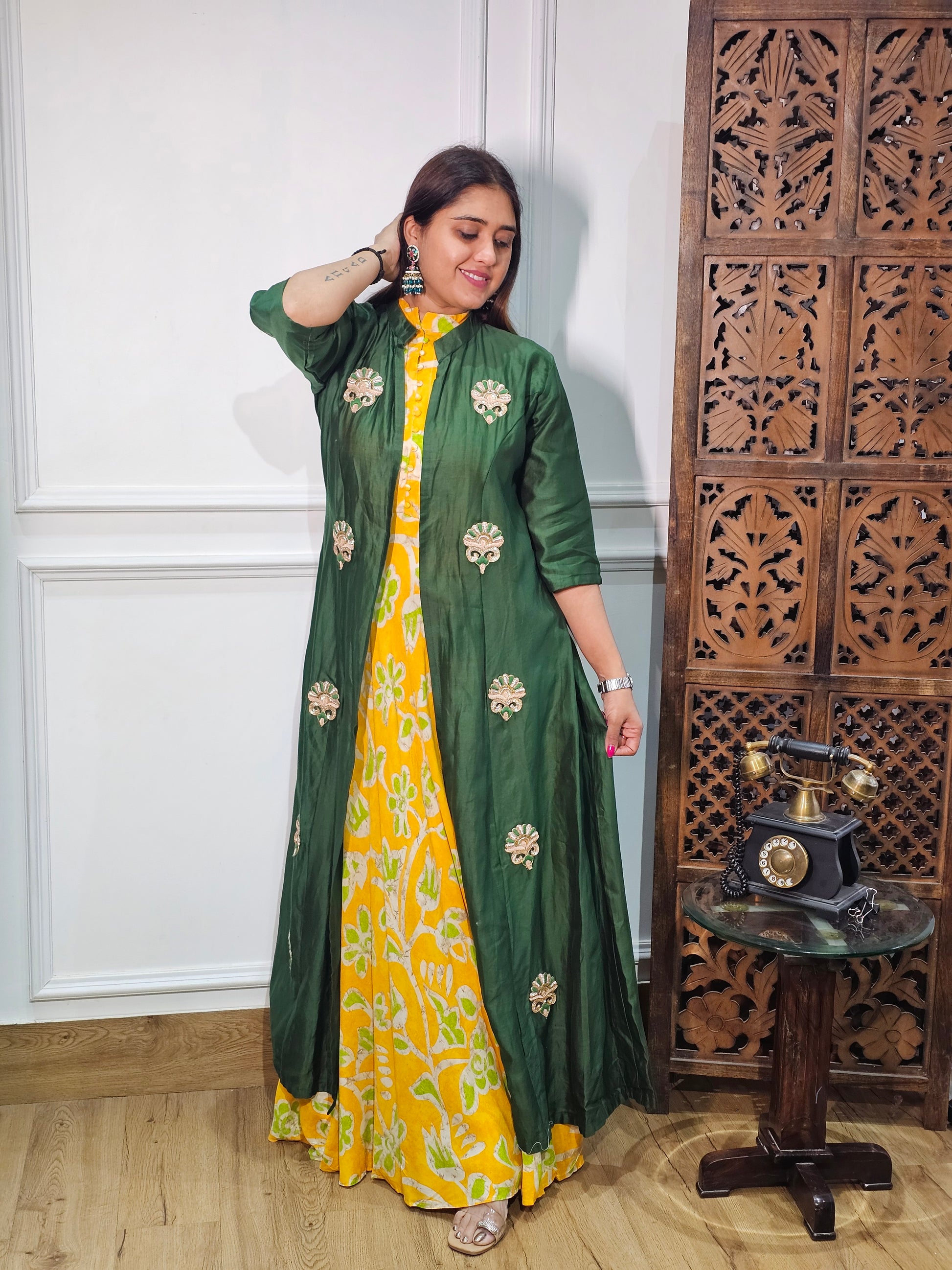 Product Description: A luxurious pure silk onepiece designed with a smooth, elegant finish. Perfect for festive occasions and stylish everyday wear with a refined touch.