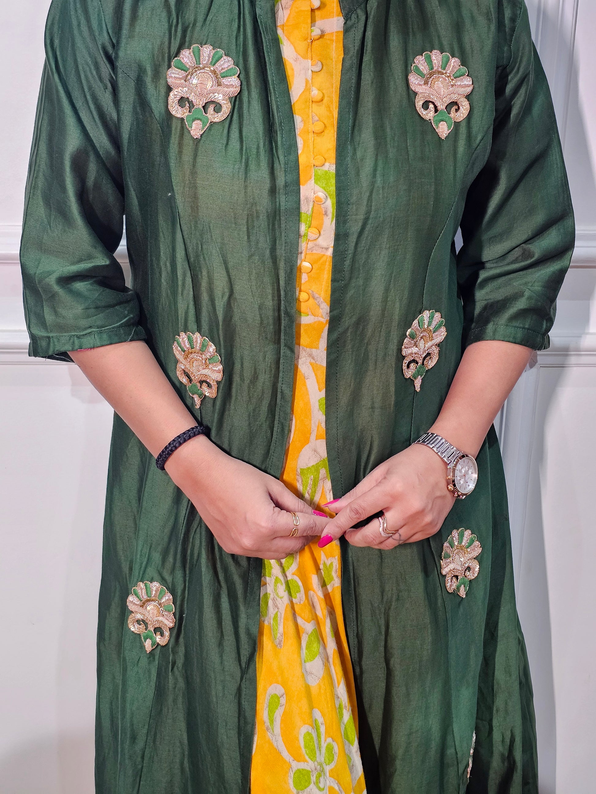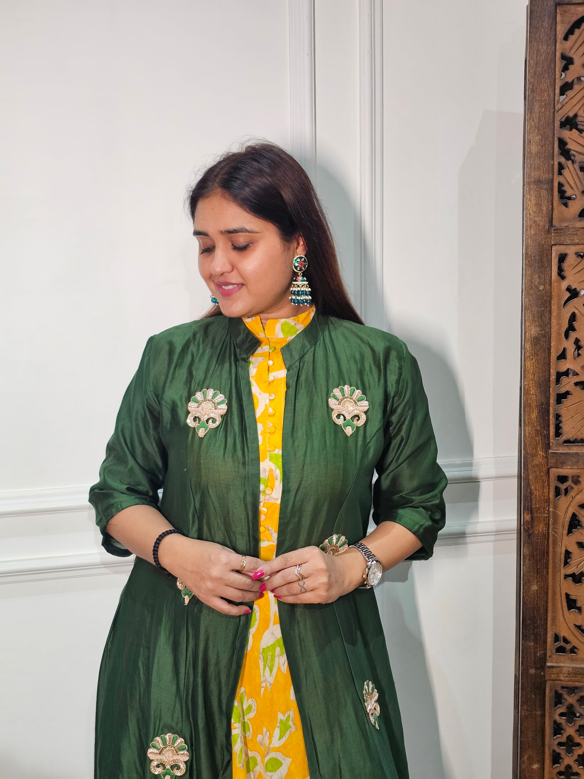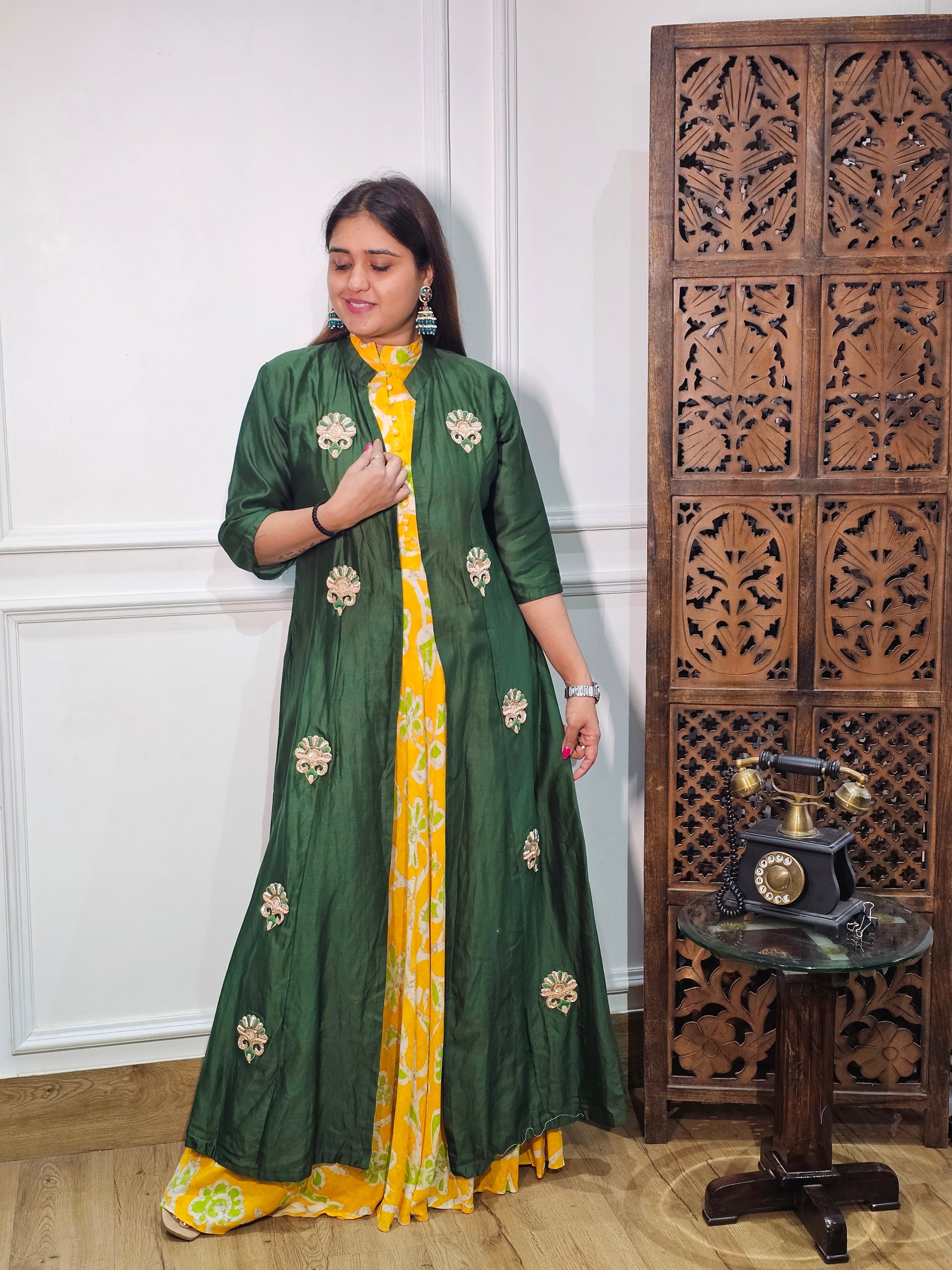 Product Description: A luxurious pure silk onepiece designed with a smooth, elegant finish. Perfect for festive occasions and stylish everyday wear with a refined touch.