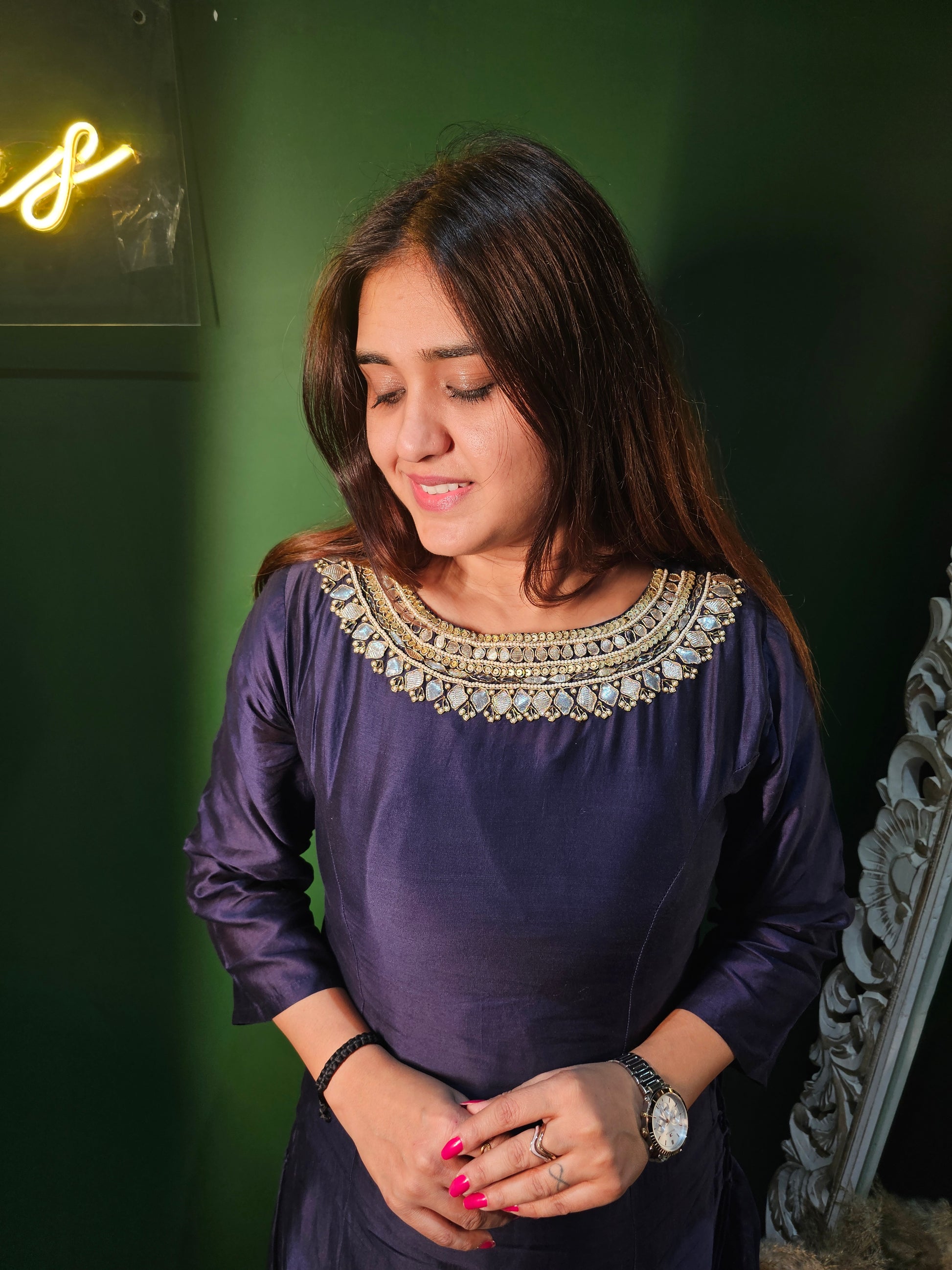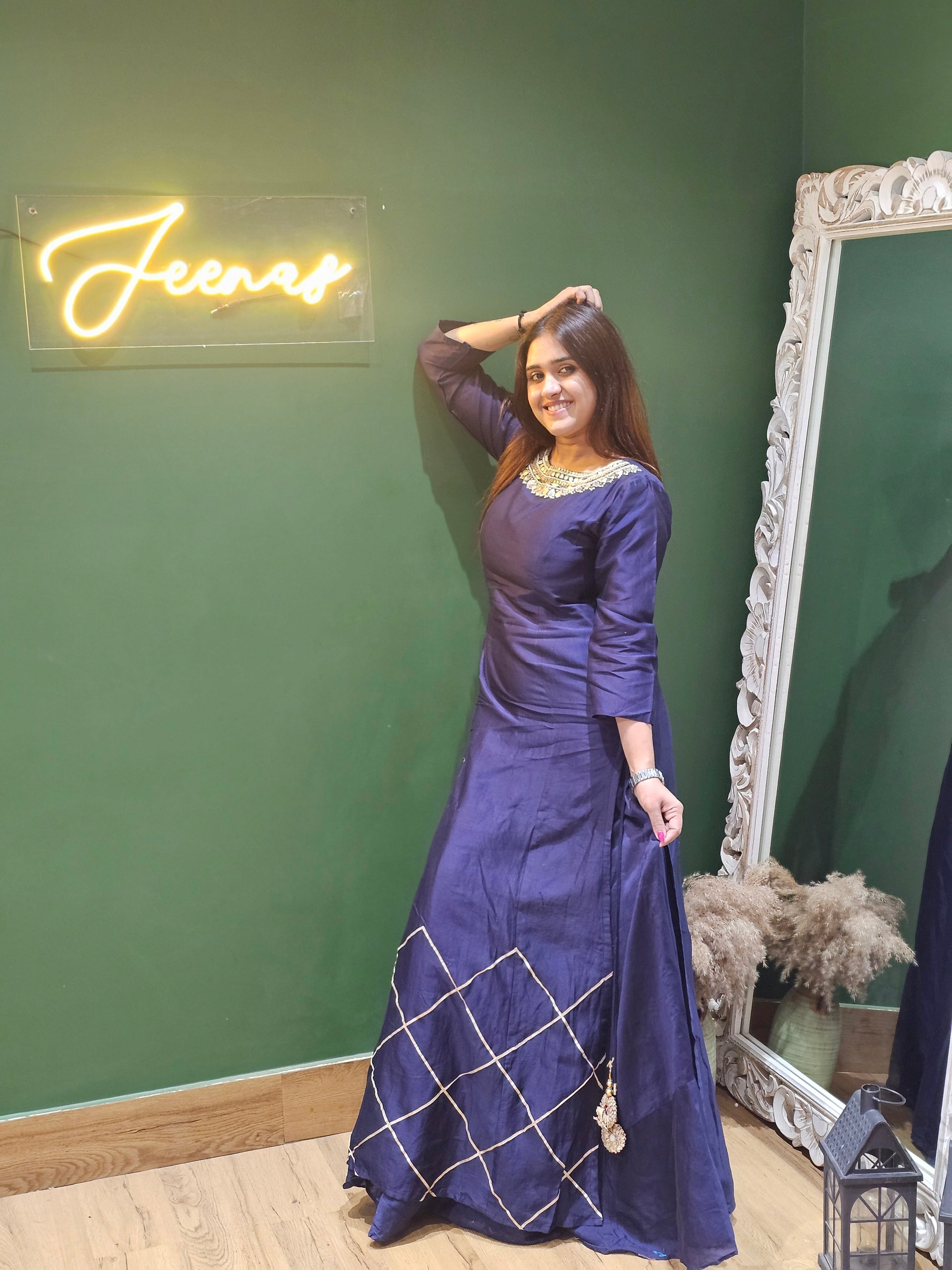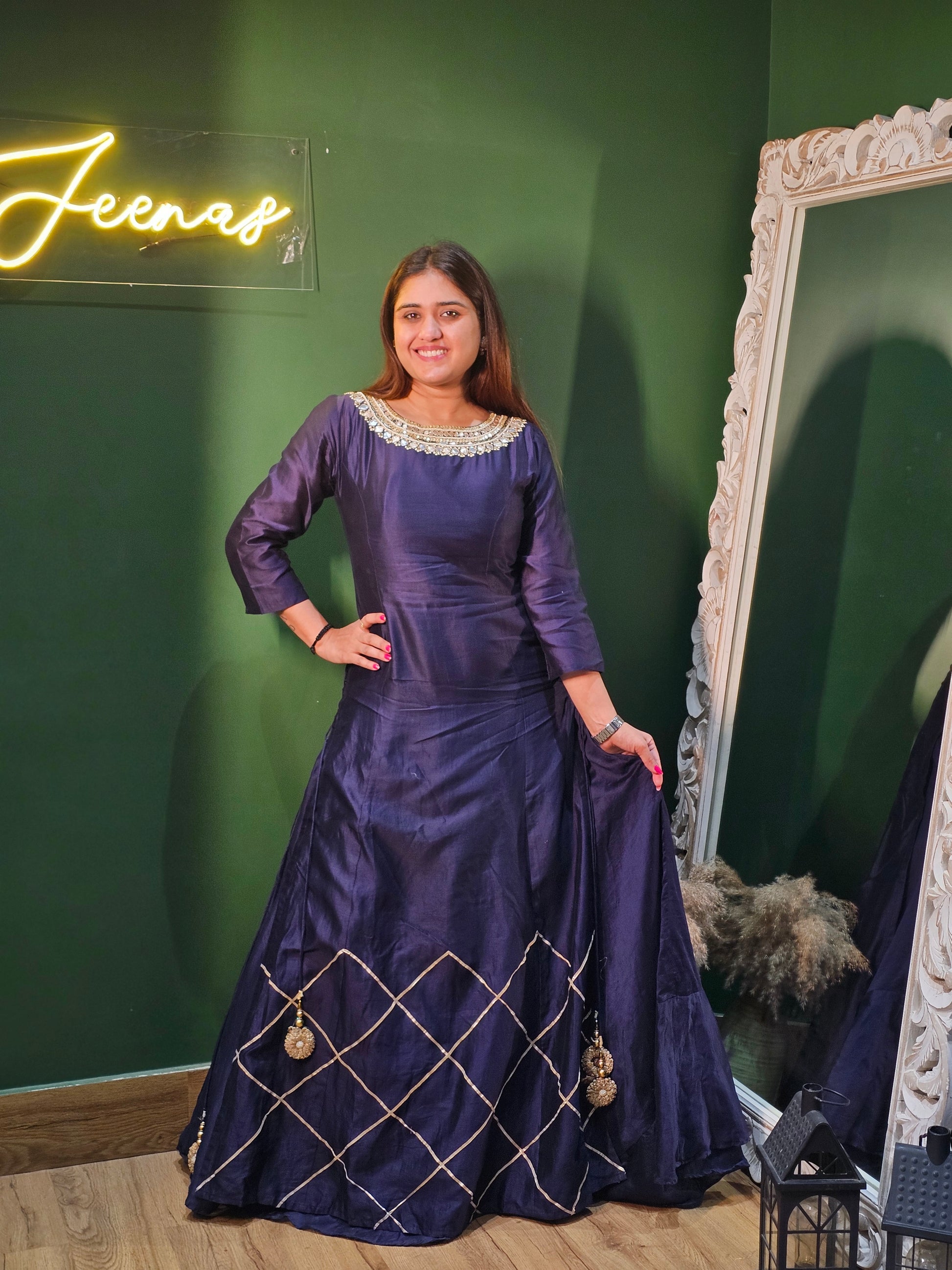 Product Description: A premium pure crepe onepiece featuring a smooth, elegant drape and modern festive look. Perfect for stylish outings and special occasions.